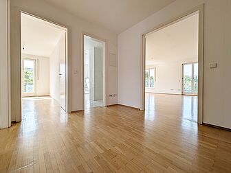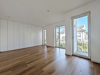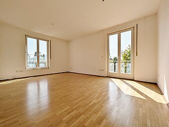 FFM-Sachsenhausen, 3,5-Zimmer-Wohnetage im modernen Solitär, ca. 125 m² Wohnfläche, 1.OG mit Lift, hohe Räume, bodentiefe Fenster, Parkettboden, Fußbodenheizung, 2 elegante Bäder, Einbauküche, sep. Hauswirtschaftsraum, 3 Balkone, TG-Stellplatz zzgl. € 30.000,-, Bezug nach Vereinbarung
