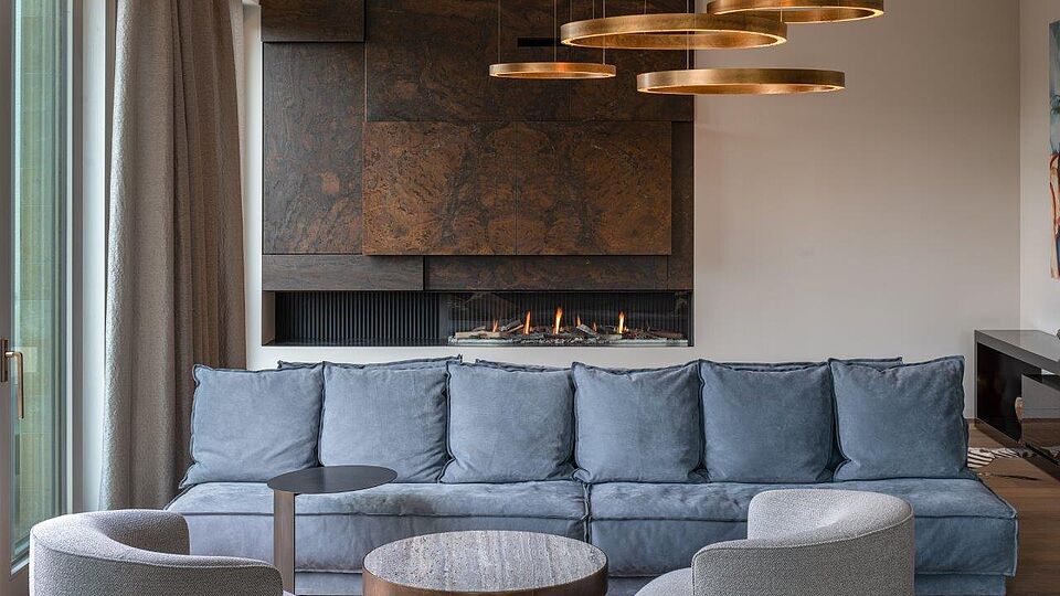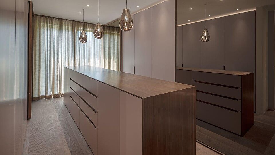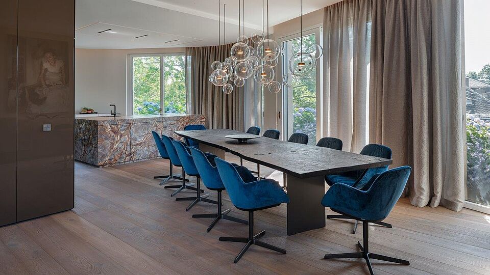 • Großzügiger Wohn- und Essbereich mit Designerküche, hochwertigen Einbaumöbeln und edlen Materialien wie Naturstein, Metall, Leder und Lack