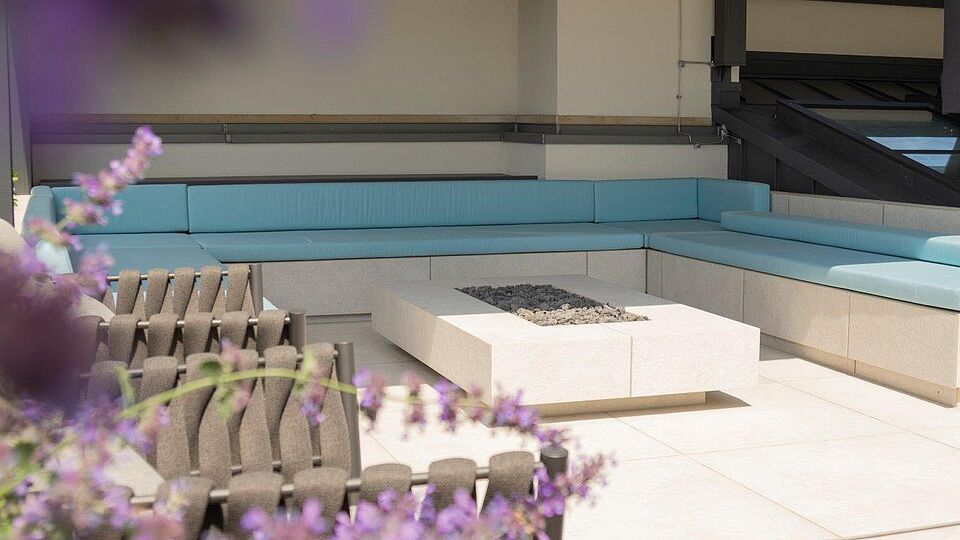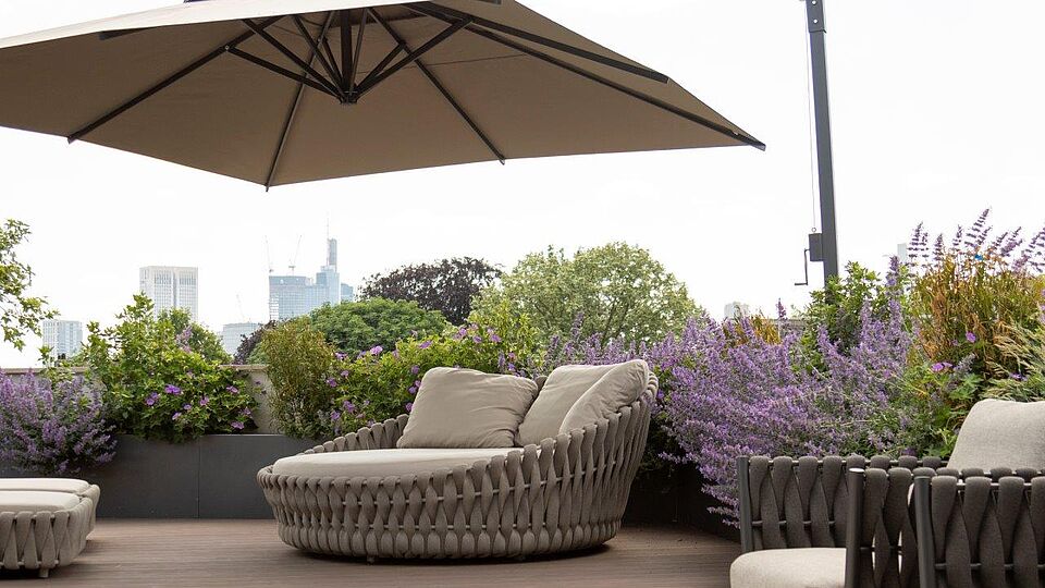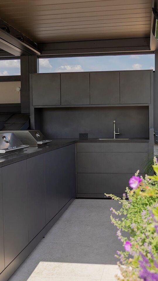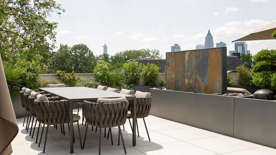 • Rund 130 m² Dachterrasse mit Skyline-Blick, Outdoor-Küche, Lounge, Essbereich, Wasserwand, Gasfeuerstelle und Outdoor-TV