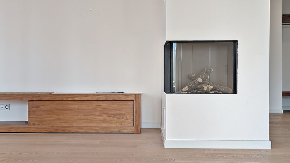 - Ca. 67 m² großer, offener Wohn-/Essbereich mit stilvollem Gaskamin, sowie elegant separierbarer Küche mit hochwertiger Schreiner-Einbauküche