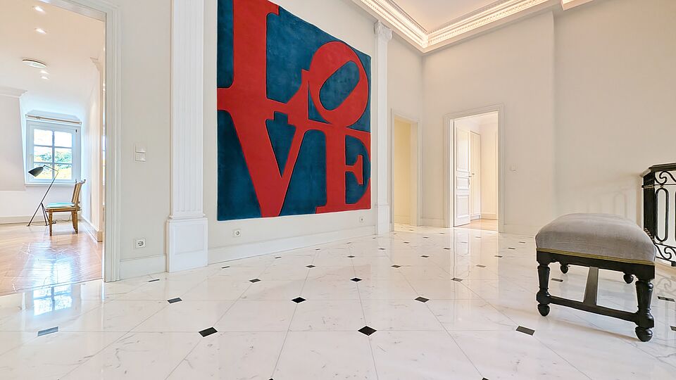 - Edles Fischgrätparkett, Stuckverzierungen und Holzvertäfelungen verleihen klassisches Flair
