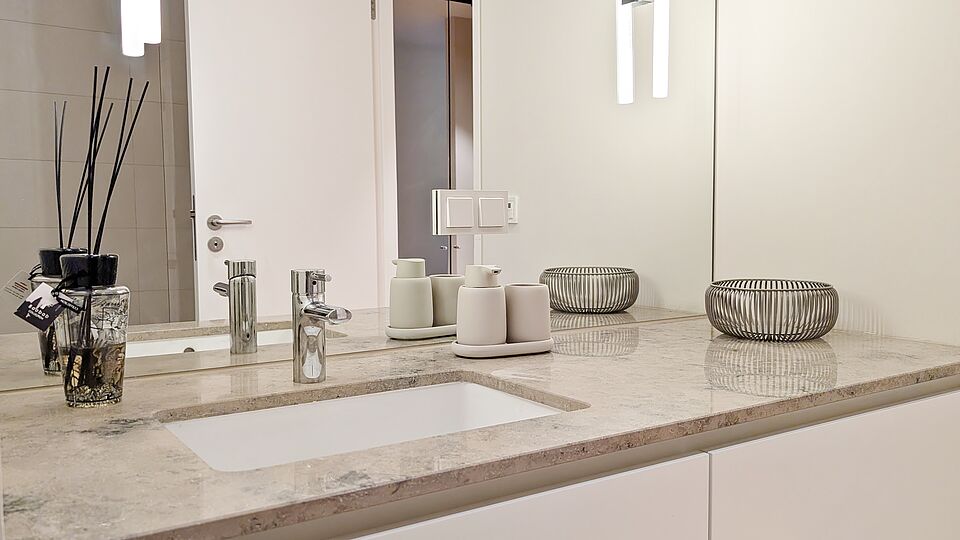 - Badezimmer mit eleganten Feinsteinfliesen – zeitloses Design, hochwertige Armaturen und durchdachte Details für ein modernes Wellnessgefühl