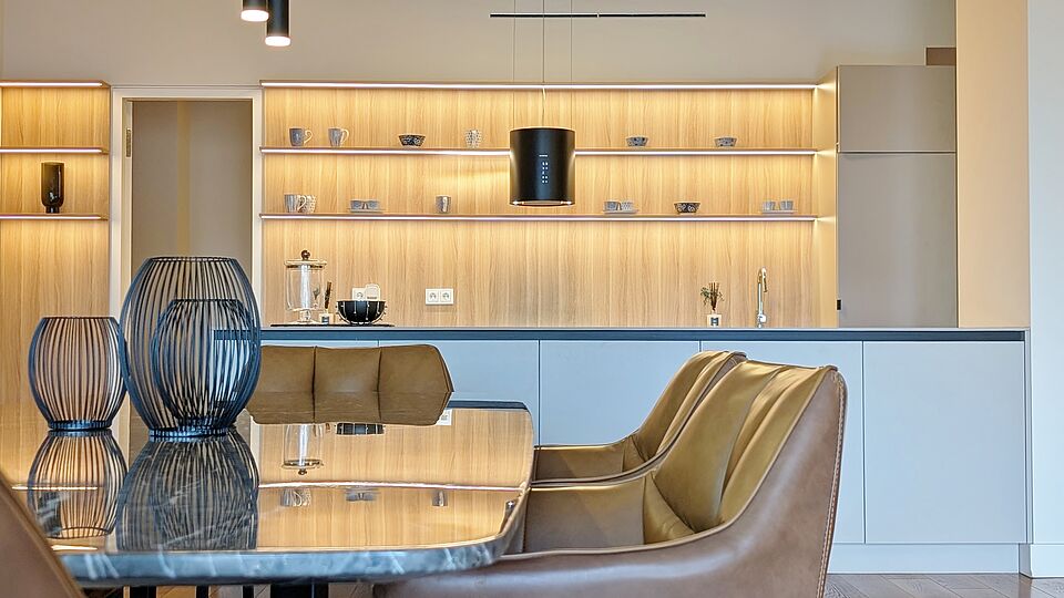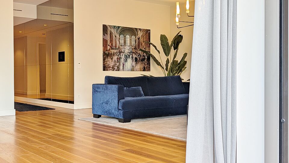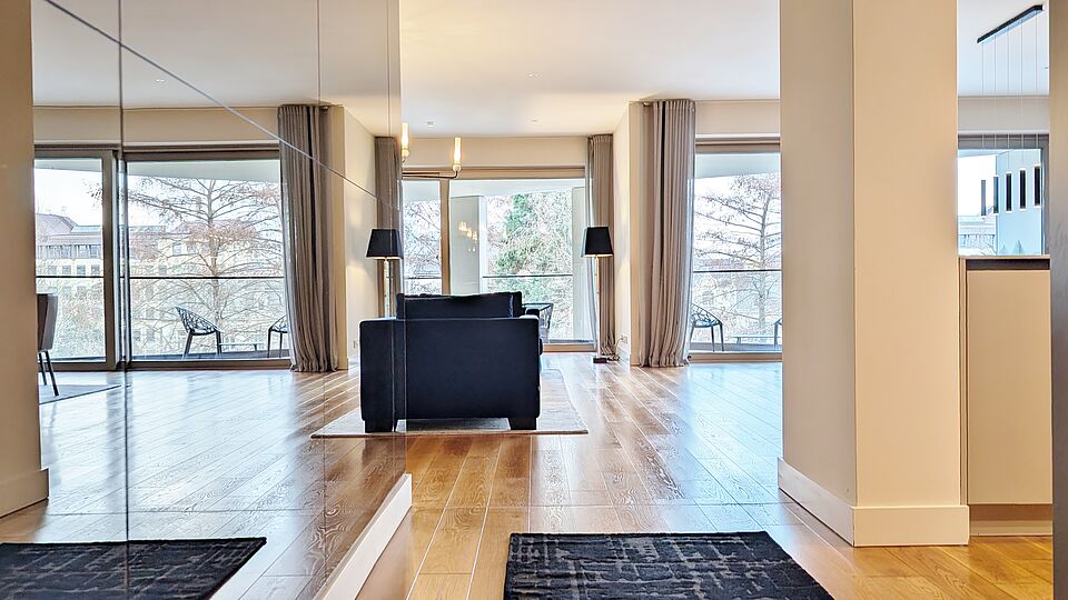 - Bodentiefe Fenster mit Dreifachverglasung sowie Sonnen- und Wärmeverglasung – lichtdurchflutete Räume bei optimalem Schall- und Wärmeschutz