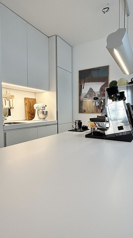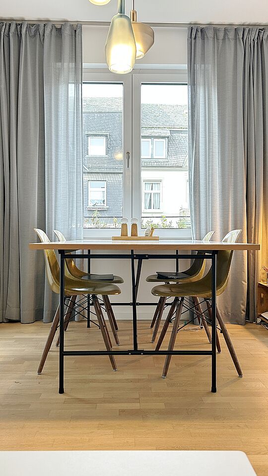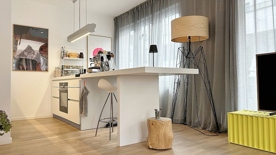 • Heller Wohn- und Essbereich mit integrierter Einbauküche