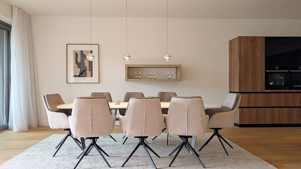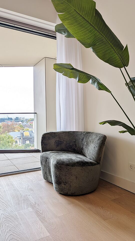• Bodentiefe Fenster mit Dreifachverglasung sowie Sonnen- und Wärmeverglasung – lichtdurchflutete Räume bei optimalem Schall- und Wärmeschutz