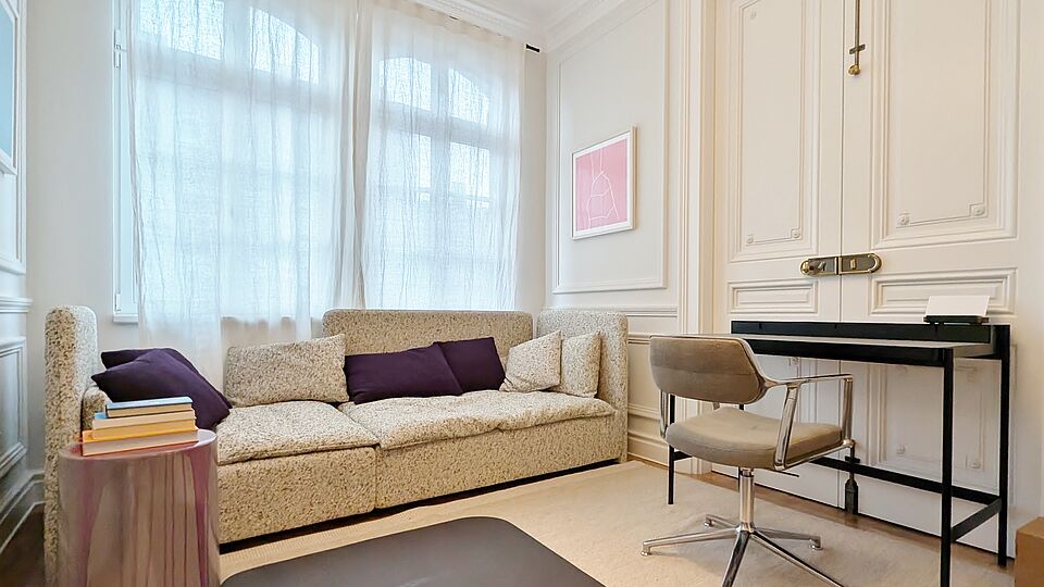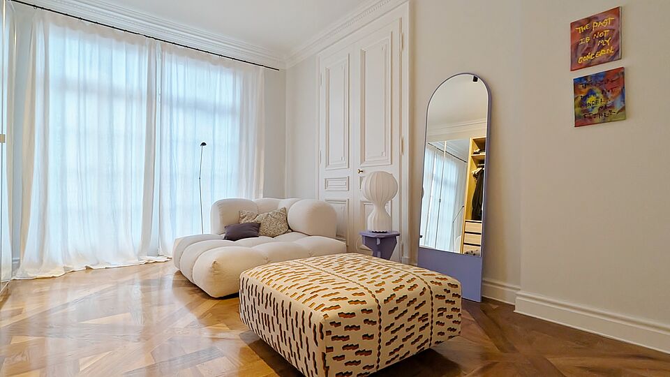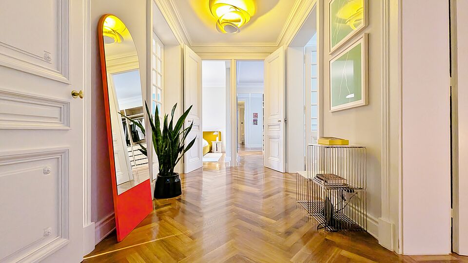 Parkettböden (Fischgrät & Tafelmuster) sowie Stuckelemente und Flügeltüren vermitteln einen klassischen Charme