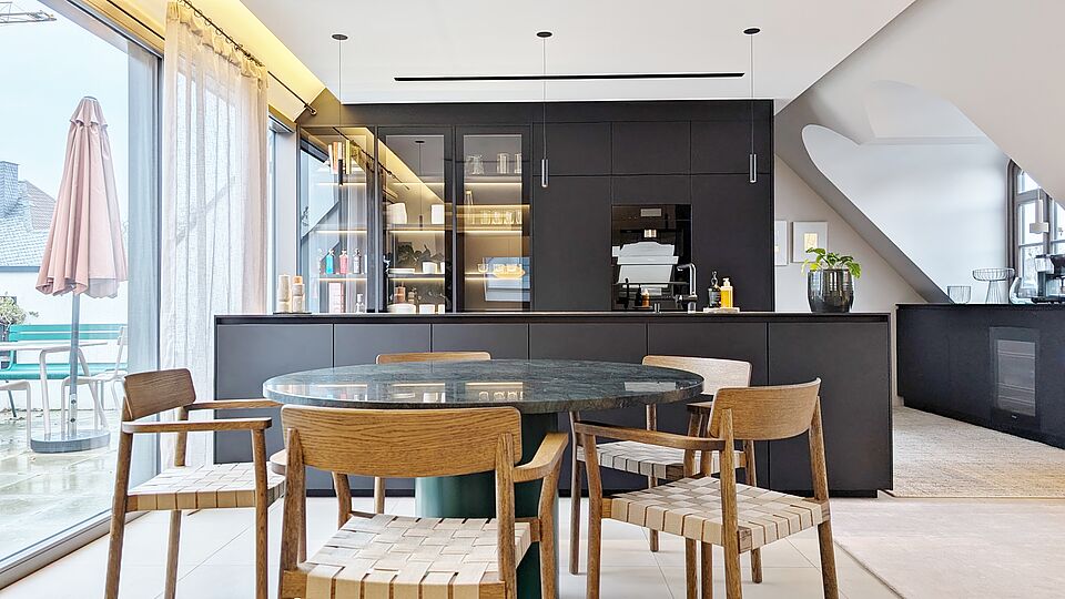 - Ca. 46 m² großer, offener Wohn-/Koch-/Essbereich mit integrierter Luxuseinbauküche und Kamin