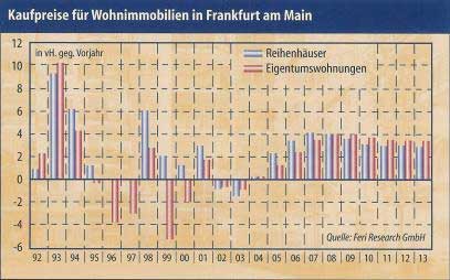 Weitgehend stabile Verhältnisse waren im vergangenen Jahr im Stadtgebiet Frankfurt auch bei den Preisen fur Eigentumswohnungen zu beobachten. Laut Feri Research erhöhte sich der Quadratmeterpreis 2004 mit 2160 Euro leicht gegenüber dem Vorjahreswert von 2141 Euro, während etwa in Mainz eine gebrauchte Wohnung in guter Lage und mit guter Ausstattung laut RDM "nur" 1430 Euro pro Quadratmeter Wohnfläche kostet.