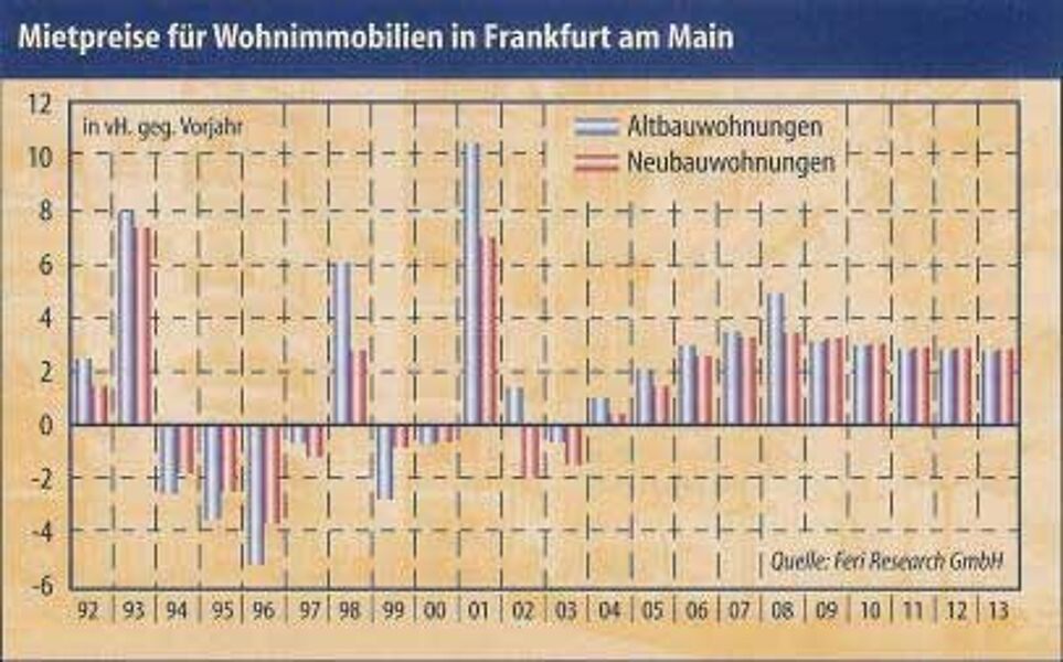 Insgesamt gesehen blieben die Mieten am Frankfurter Wohnungsmarkt im abgelaufenen Jahr auf hohem Niveau stabil. Laut Feri Research GmbH mussten 2004 für eine Altbaumietwohnung im Schnitt pro Quadratmeter 7,80 Euro gegenüber 7,70 Euro im Vorjahr bezahlt werden. Für Neubaumietwohnungen stieg der Quadratmeterpreis im selben Zeitraum von neun auf 9,10 Euro. Deutlich günstiger wohnt man beispielsweise in Offenbach oder Gießen: Hier liegt der Quadratmeterpreis laut RDM Landesverband Hessen für Wohnungen mit gutem Wohnwert bei 6,50 beziehungsweise bei 5,10 Euro.