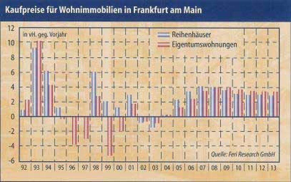 Dem Feri-Experten zufolge lässt die erwartete Wirtschaft-, Bevölkerungs- und Einkommensentwicklung in den kommenden Jahren auch eine Nachfragebelebung bei Wohneigentum erwarten. "Dagegen wird das Angebot im Stadtgebiet sinken, das bereits heute im Bereich Einfamilien- und Reihenhäuser in den gefragten Wohngegenden relativ knapp ist". Aus diesen Gründen sei in den nächsten Jahren mit steigenden Preisen in allen Segmenten des Marktes für Wohneigentum in Frankfurt zu rechnen.Verhaltener äußern sich die Analysten der HVB Expertise GmbH, lmmobilienberatungsgesellschaft der HVB Group: Sie hegen Zweifel, ob die Preise für Eigentumswohnungen in Frankfurt angesichts der wirtschaftlichen Lage stabil bleiben werden. Deutliche Rückgänge erwarten aber auch sie nicht.